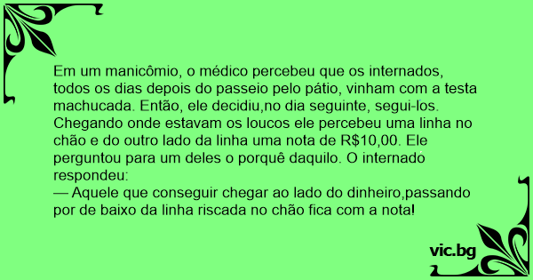Em um manicômio, o médico percebeu que os internados, todos os dias depois do passeio pelo pátio, vinham com a testa machucada. Então, ele decidiu,no dia seguinte, segui-los. Chegando onde estavam os loucos ele percebeu uma linha no chão e do outro lado da linha uma nota de R$10,00. Ele perguntou para um deles o porquê daquilo. O internado respondeu: