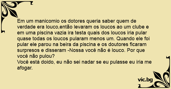 Em um manicomio os dotores queria saber quem de verdade era louco,então levaram os loucos ao um clube e em uma piscina vazia ira testa quais dos loucos iria pular quase todas os loucos pularam menos um. Quando ele foi pular ele parou na beira da piscina e os doutores ficaram surpresos e disseram -Nossa você não é louco. Por que você não pulou?