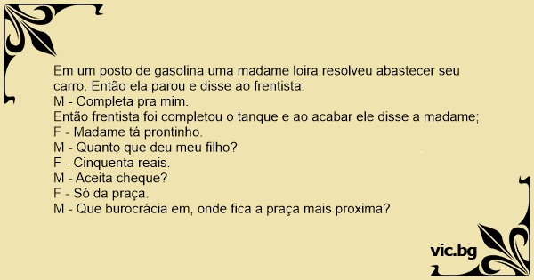 Então frentista foi completou o tanque e ao acabar ele disse a madame;