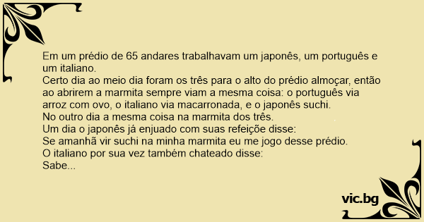 Certo dia ao meio dia foram os três para o alto do prédio almoçar, então ao abrirem a marmita sempre viam a mesma coisa: o português via arroz com ovo, o italiano via macarronada, e o japonês suchi.