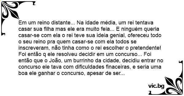 Em um reino distante... Na idade média, um rei tentava casar sua filha mas ele era muito feia... E ninguém queria casar-se com ela o rei teve sua ideia genial, ofereceu todo o seu reino pra quem casar-se com ela todos se inscreveram, não tinha como o rei escolher o pretendente!