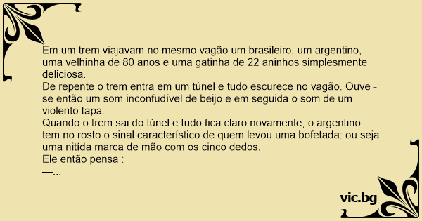 No trem estavam um brasileiro, um argentino, uma velha, uma mulher muito gostosa e um argentino. O trem entra num túnel e se ouve um barulho de beijo e logo depois de tapa. A velha pensa: "Um dos...