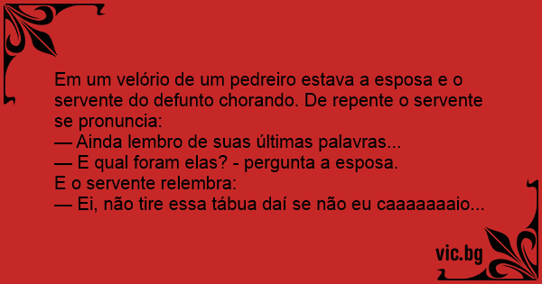 Em um velório de um pedreiro estava a esposa e o servente do defunto chorando. De repente o servente se pronuncia: