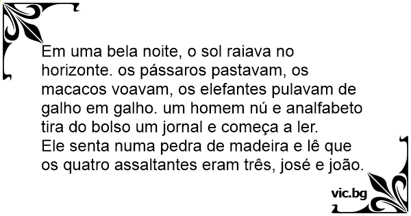Em uma bela noite, o sol raiava no horizonte. os pássaros pastavam, os macacos voavam, os elefantes pulavam de galho em galho. um homem nú e analfabeto tira do bolso um jornal e começa a ler.