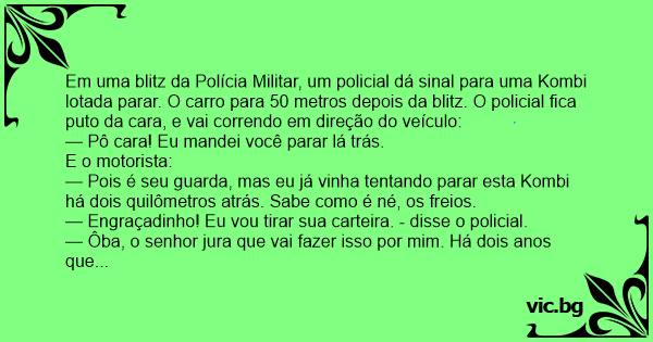 Em uma blitz da Polícia Militar, um policial dá sinal para uma Kombi lotada parar. O carro para 50 metros depois da blitz. O policial fiса рuто da cara, e vai correndo em direção do veículo: