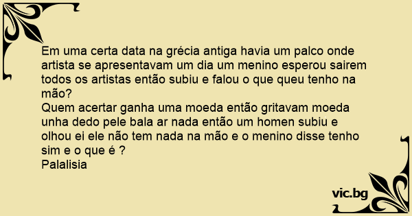 Em uma certa data na grécia antiga havia um palco onde artista se apresentavam um dia um menino esperou sairem todos os artistas então subiu e falou o que queu tenho na mão?