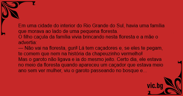 — Não vai na floresta, guri! Lá tem caçadores e, se eles te pegam, te comem que nem na história da chapeuzinho vermelho!