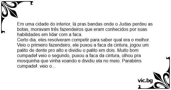 Veio o primeiro fazendeiro, ele puxou a faca da cintura, jogou um palito de dente pro alto e dividiu o palito em dois. Muito bom cumpade! veio o segundo, puxou a faca da cintura, olhou pra mosquinha que vinha voando e dividiu ela no meio. Parabéns cumpade!. veio o terceiro, puxou a faca da cintura, olhou atentamente pro pernelongo que vinha em sua direção, e desceu a faca no danado, o pernelongo saiu voando. Os dois cumpade caindo de da risada perguntam em tom de ironia! Ué cumpade se num matou o вiсhо?