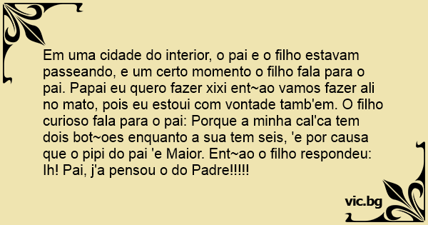 Em uma cidade do interior, o pai e o filho estavam passeando, e um certo momento o filho fala para o pai. Papai eu quero fazer xixi ent~ao vamos fazer ali no mato, pois eu estoui com vontade tamb'em. O filho curioso fala para o pai: Porque a minha cal'ca tem dois bot~oes enquanto a sua tem seis, 'e por causa que o pipi do pai 'e Maior. Ent~ao o filho respondeu: