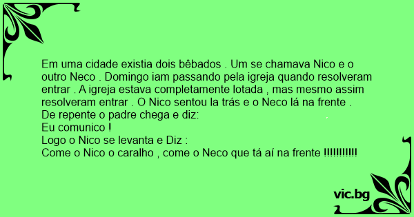 Em uma cidade existia dois bêbados . Um se chamava Nico e o outro Neco . Domingo iam passando pela igreja quando resolveram entrar . A igreja estava completamente lotada , mas mesmo assim resolveram entrar . O Nico sentou la trás e o Neco lá na frente .
