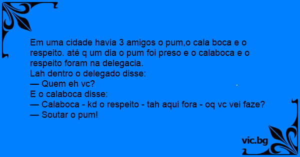 Em uma cidade havia 3 amigos o pum,o cala boca e o respeito. até q um dia o pum foi preso e o calaboca e o respeito foram na delegacia.