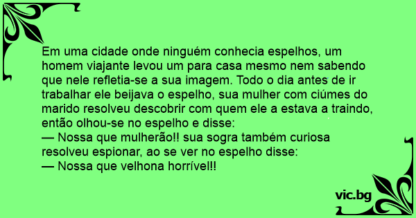 Em uma cidade onde ninguém conhecia espelhos, um homem viajante levou um para casa mesmo nem sabendo que nele refletia-se a sua imagem. Todo o dia antes de ir trabalhar ele beijava o espelho, sua mulher com ciúmes do marido resolveu descobrir com quem ele a estava a traindo, então olhou-se no espelho e disse: