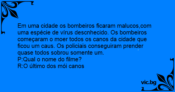 Em uma cidade os bombeiros ficaram malucos,com uma espécie de vírus descnhecido. Os bombeiros começaram o moer todos os canos da cidade que ficou um caus. Os policiais conseguiram prender quase todos sobrou somente um.