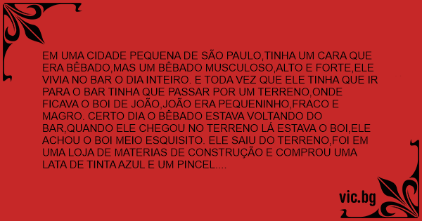 EM UMA CIDADE PEQUENA DE SÃO PAULO,TINHA UM CARA QUE ERA BÊBADO,MAS UM BÊBADO MUSCULOSO,ALTO E FORTE,ELE VIVIA NO BAR O DIA INTEIRO. E TODA VEZ QUE ELE TINHA QUE IR PARA O BAR TINHA QUE PASSAR POR UM TERRENO,ONDE FICAVA O BOI DE JOÃO,JOÃO ERA PEQUENINHO,FRACO E MAGRO. CERTO DIA O BÊBADO ESTAVA VOLTANDO DO BAR,QUANDO ELE CHEGOU NO TERRENO LÁ ESTAVA O BOI,ELE ACHOU O BOI MEIO ESQUISITO. ELE SAIU DO TERRENO,FOI EM UMA LOJA DE MATERIAS DE CONSTRUÇÃO E COMPROU UMA LATA DE TINTA AZUL E UM PINCEL. DEPOIS VOLTOU PARA O TERRENO,FOI ONDE O BOI ESTAVA,CHEGANDO LÁ,ELE PEGOU E PINTOU TODO O BOI DE AZUL. E VOLTOU PARA O BAR. JOÃO VOLTOU DO TRABALHO E FOI PEGAR O BOI,QUANDO ELE VIU O BOI PINTADO ELE JÁ DESCONFIOU QUE FOI ALGUM BÊBADO QUE ESTAVA INDO PARA O BAR E PINTOU O BOI DELE. JOÃO FOI ATÉ O BAR E FALOU BEM ALTO NA PORTA: QUEM FOI O DESGRAÇADO QUE PINTOU MEU BOI?O BÊBADO MUSCOLOSO E FORTE SE LEVANTOU E FALOU: FUI EU PORQUÊ,FRAQUINHO?O JOÃO COMO ERA FRACO E MAGRO NÃO TINHA CONDIÇÕES DE BRIGAR COM O BÊBADO,E ENTÃO JOÃO RESPONDEU: PODE PASSAR A 2ª MÃO,PORQUE A 1ª JÁ SECOU.