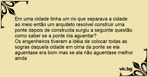 Os engenheiros tiveram a idéia de colocar todas as sogras daquela cidade em cima da ponte se ela aguentase era bom mas se ela não aguentase melhor ainda