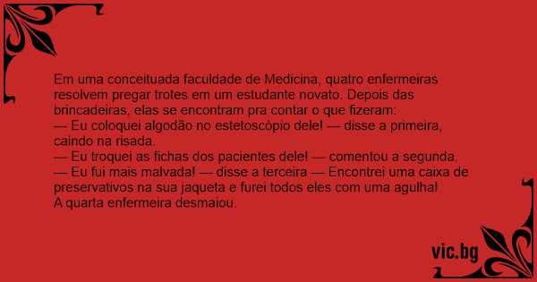 — Eu coloquei algodão no estetoscópio dele! — disse a primeira, caindo na risada.