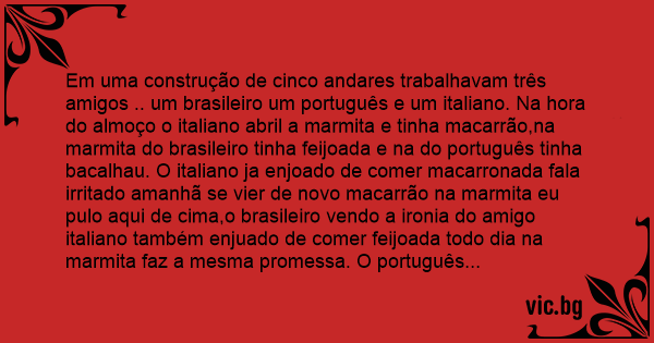 Em uma construção de cinco andares trabalhavam três amigos .. um brasileiro um português e um italiano. Na hоrа do almoço o italiano abril a marmita e tinha macarrão,na marmita do brasileiro tinha feijoada e na do português tinha bacalhau. O italiano ja enjoado de comer macarronada fala irritado amanhã se vier de novo macarrão na marmita eu pulo aqui de cima,o brasileiro vendo a ironia do amigo italiano também enjuado de comer feijoada todo dia na marmita faz a mesma promessa. O português também enjuado de comer todo dia bacalhau ´promete pular do prédio se repetir a marmita. No outro dia como de costume subiram para almoçar abrindo a marmita o italiano se deparou com macarronada não penssou duas vezes e pulou assim fez o brazileiro e o portugues... No dia do velorio dos três todos ficaram sabendo da história. Amulher do italiano e a do brasileiro inconformadas falam ;se eles tivessem falado nós tinha mudado o cardápio. A do português sem entender questiona... Ora raios não pode ser pois era ele quem fazia a marmita.