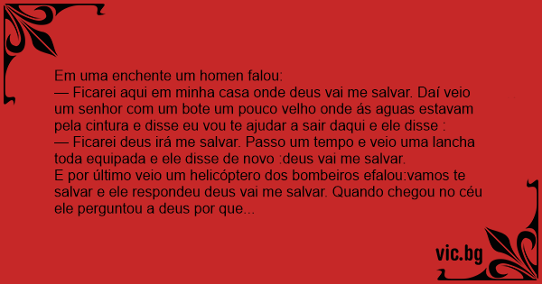 E por último veio um helicóptero dos bombeiros efalou:vamos te salvar e ele respondeu deus vai me salvar. Quando chegou no céu ele perguntou a deus por que você não me salvou e deus lhe respondeu mandei um bote velho,uma lancha e um helicóptero e você não quis ser salvo!!!!!!