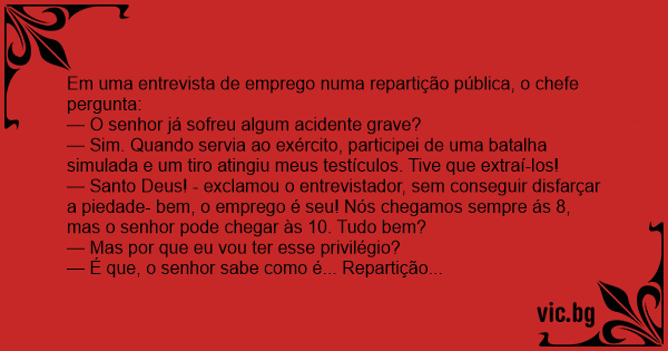 — Santo Deus! - exclamou o entrevistador, sem conseguir disfarçar a piedade- bem, o emprego é seu! Nós chegamos sempre ás 8, mas o senhor pode chegar às 10. Tudo bem?