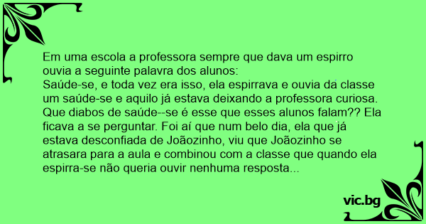 Saúde-se, e toda vez era isso, ela espirrava e ouvia da classe um saúde-se e aquilo já estava deixando a professora curiosa. Que diabos de saúde--se é esse que esses alunos falam?? Ela ficava a se perguntar. Foi aí que num belo dia, ela que já estava desconfiada de Joãozinho, viu que Joãozinho se atrasara para a aula e combinou com a classe que quando ela espirra-se não queria ouvir nenhuma resposta deles. Passou-se algum tempo e Joãozinho chegou sem saber de nada, sentou-se normalmente como todos os dias e ficou assistindo aula junto com seus colegas. De repente a professora espirra (de propósito) e a sala fiса quieta mas Joãozinho não e de em alto e bom som: F O D A - S E