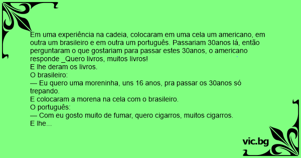 Em uma experiência na cadeia, colocaram em uma cela um americano, em outra um brasileiro e em outra um português. Passariam 30anos lá, então perguntaram o que gostariam para passar estes 30anos, o americano responde _Quero livros, muitos livros!