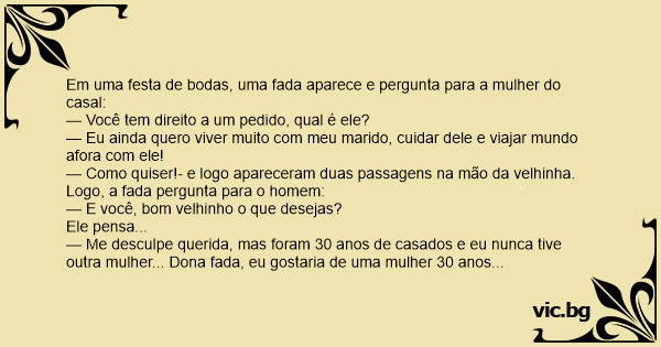 — Me desculpe querida, mas foram 30 anos de casados e eu nunca tive outra mulher... Dona fada, eu gostaria de uma mulher 30 anos mais jovem que eu e que seja toda gostosona!