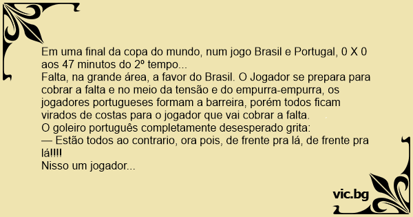 Em uma final da copa do mundo, num jogo Brasil e Portugal, 0 X 0 aos 47 minutos do 2º tempo...