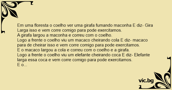 Em uma floresta o coelho ver uma girafa fumando maconha E diz- Gira Larga isso e vem corre comigo para pode exercitamos.