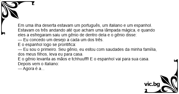 E o gênio levanta as mãos e tchhuufff! E o espanhol vai para sua casa. Depois vem o italiano: