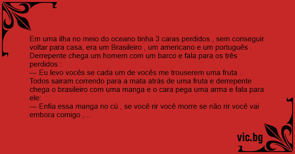 Em uma ilha no meio do oceano tinha 3 caras perdidos , sem conseguir voltar para casa, era um Brasileiro , um americano e um português .
