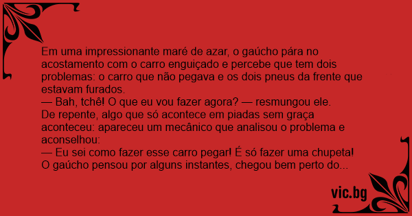 O gaúcho pensou por alguns instantes, chegou bem perto do mecânico e cochichou: