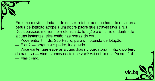 — Enquanto este homem, motorista de lotação, que dirige feito louco nas ruas, chega no céu e vai logo entrando? Deve haver algum engano!