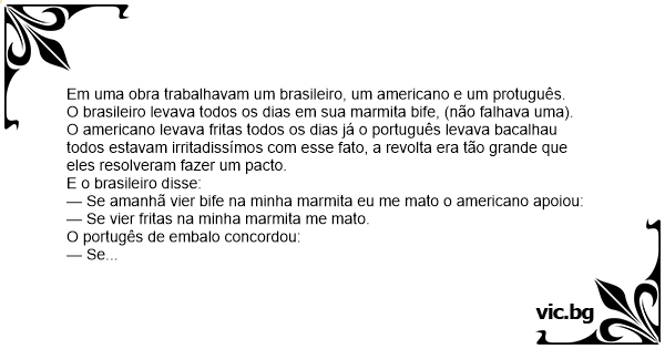 O americano levava fritas todos os dias já o português levava bacalhau todos estavam irritadissímos com esse fato, a revolta era tão grande que eles resolveram fazer um pacto.