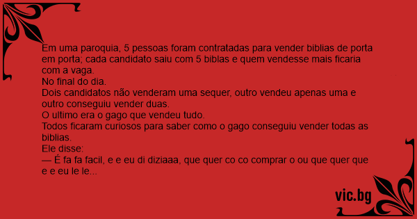 Todos ficaram curiosos para saber como o gago conseguiu vender todas as biblias.