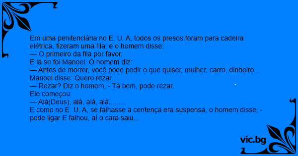 Em uma penitenciária no E. U. A, todos os presos foram para cadeira elétrica, fizeram uma fila, e o homem disse: