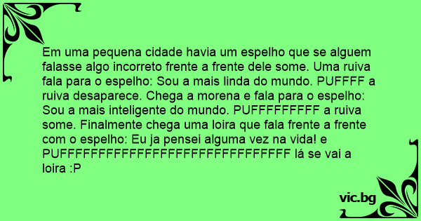 Em uma pequena cidade havia um espelho que se alguem falasse algo incorreto frente a frente dele some. Uma ruiva fala para o espelho: Sou a mais linda do mundo. PUFFFF a ruiva desaparece. Chega a morena e fala para o espelho: Sou a mais inteligente do mundo. PUFFFFFFFFF a ruiva some. Finalmente chega uma loira que fala frente a frente com o espelho: Eu ja pensei alguma vez na vida! e PUFFFFFFFFFFFFFFFFFFFFFFFFFFFFFF lá se vai a loira :P