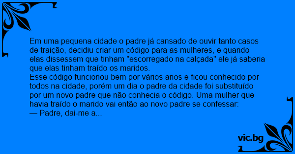 Esse código funcionou bem por vários anos e ficou conhecido por todos na cidade, porém um dia o padre da cidade foi substituído por um novo padre que não conhecia o código. Uma mulher que havia traído o marido vai então ao novo padre se confessar: