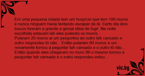 Em uma pequena cidade tem um hospício que tem 100 muros e nunca ninguem havia tentando escapar de lá. Certo dia dois loucos tiveram a grande e genial idéia de fugir. Na noite escolhida estavam lah eles pulando os muros...