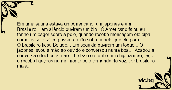 Em uma sauna estava um Americano, um japones e um Brasileiro... em silêncio ouviram um bip.. O Americano falou eu tenho um pager sobre a pele, quando recebo mensagem ele bipa como aviso é só eu passar a mão sobre a pele que ele para.