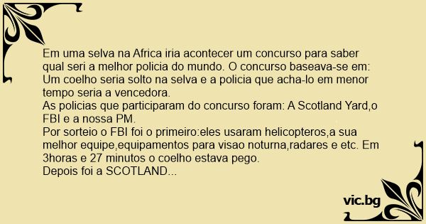 Em uma selva na Africa iria acontecer um concurso para saber qual seri a melhor policia do mundo. O concurso baseava-se em: