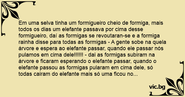 Em uma selva tinha um formigueiro cheio de formiga, mais todos os dias um elefante passava por cima desse formigueiro, daí as formigas se revoutaran-se e a formiga rainha disse para todas as formigas - A gente sobe na quela árvore e espera ao elefante passar, quando ele passar nós pulamos em cima dele!!!!!! - dai as formigas subiram na árvore e ficaram esperando o elefante passar, quando o elefante passou as formigas pularam em cima dele, só todas cairam do elefante mais só uma ficou no pescoso do elefante, e as formigas que tinha caido do elefante ficaram gritando Inforca!!! Inforca!!!! Inforca!!!!!