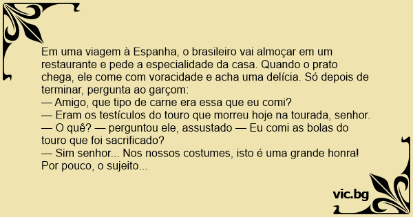 — Eram os testículos do touro que morreu hoje na tourada, senhor.