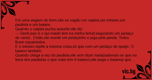 Em uma viagem de trem,vão no vagão um caipira,um mineiro,um paulista e um baiano.