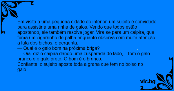 Em visita a uma pequena cidade do interior, um sujeito é convidado para assistir a uma rinha de galos. Vendo que todos estão apostando, ele também resolve jogar. Vira-se para um caipira, que fuma um cigarrinho de palha enquanto observa com muita atenção a luta dos bichos, e pergunta: