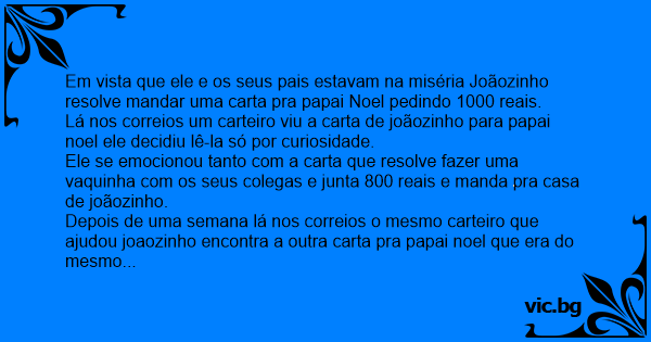 Lá nos correios um carteiro viu a carta de joãozinho para papai noel ele decidiu lê-la só por curiosidade.