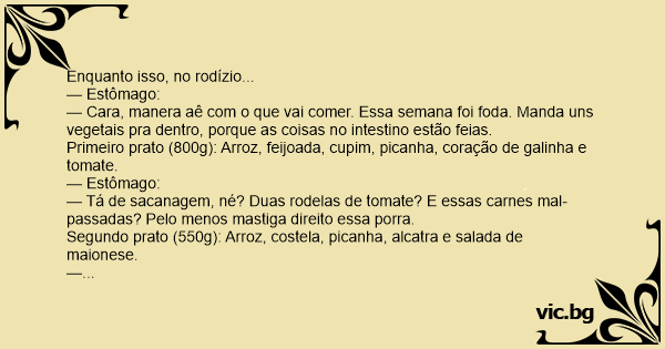 — Chega de carne, cara, não cabe mais nada aqui. Lembra daquela úlcera? Tá faltando pouco pra cicatriz abrir. Tu quer fuder com tudo, né ? Manda um pouco de água.