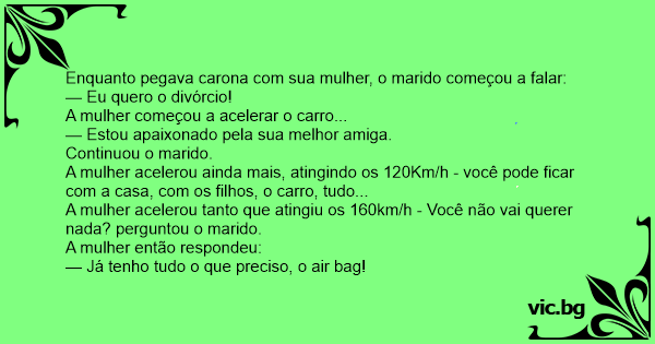 A mulher acelerou tanto que atingiu os 160km/h - Você não vai querer nada? perguntou o marido.