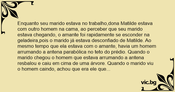 Enquanto seu marido estava no trabalho,dona Matilde estava com outro homem na cama, ao perceber que seu marido estava chegando, o amante foi rapidamente se esconder na geladeira,pois o marido já estava desconfiado de Matilde. Ao mesmo tempo que ela estava com o amante, havia um homem arrumando a antena parabólica no teto do prédio. Quando o marido chegou o homem que estava arrumando a antena resbalou e caiu em cima de uma árvore. Quando o marido viu o homem caindo, achou que era ele que estava lhe pondo chifres, e jogou a geladeira na cabeça dele. Ele ficou arrependido e se matou. Quando chegaram no céu, o primeiro disse para São Pedro o seguinte: