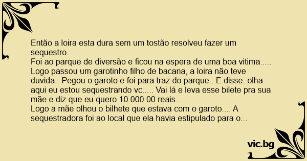 Logo passou um garotinho filho de bacana, a loira não teve duvida.. Pegou o garoto e foi para traz do parque.. E disse: olha aqui eu estou sequestrando vc..... Vai lá e leva esse bilete pra sua mãe e diz que eu quero 10.000 00 reais...