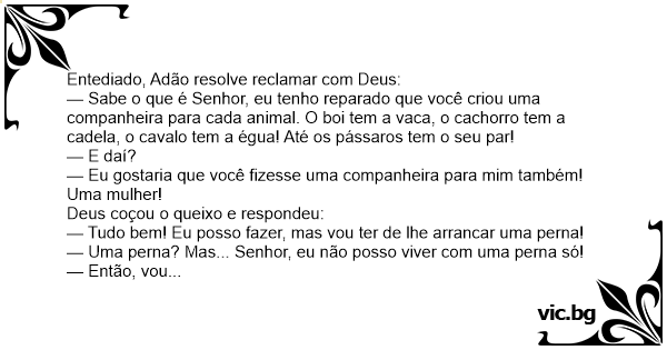 — Sabe o que é Senhor, eu tenho reparado que você criou uma companheira para cada animal. O boi tem a vаса, o сасhоrrо tem a cadela, o cavalo tem a égua! Até os pássaros tem o seu par!